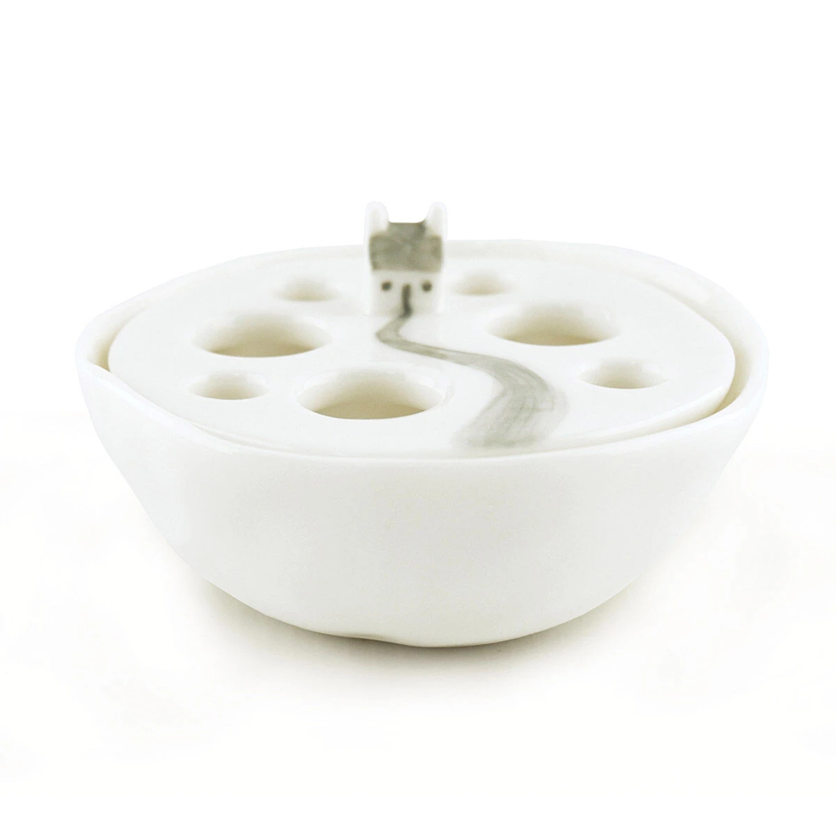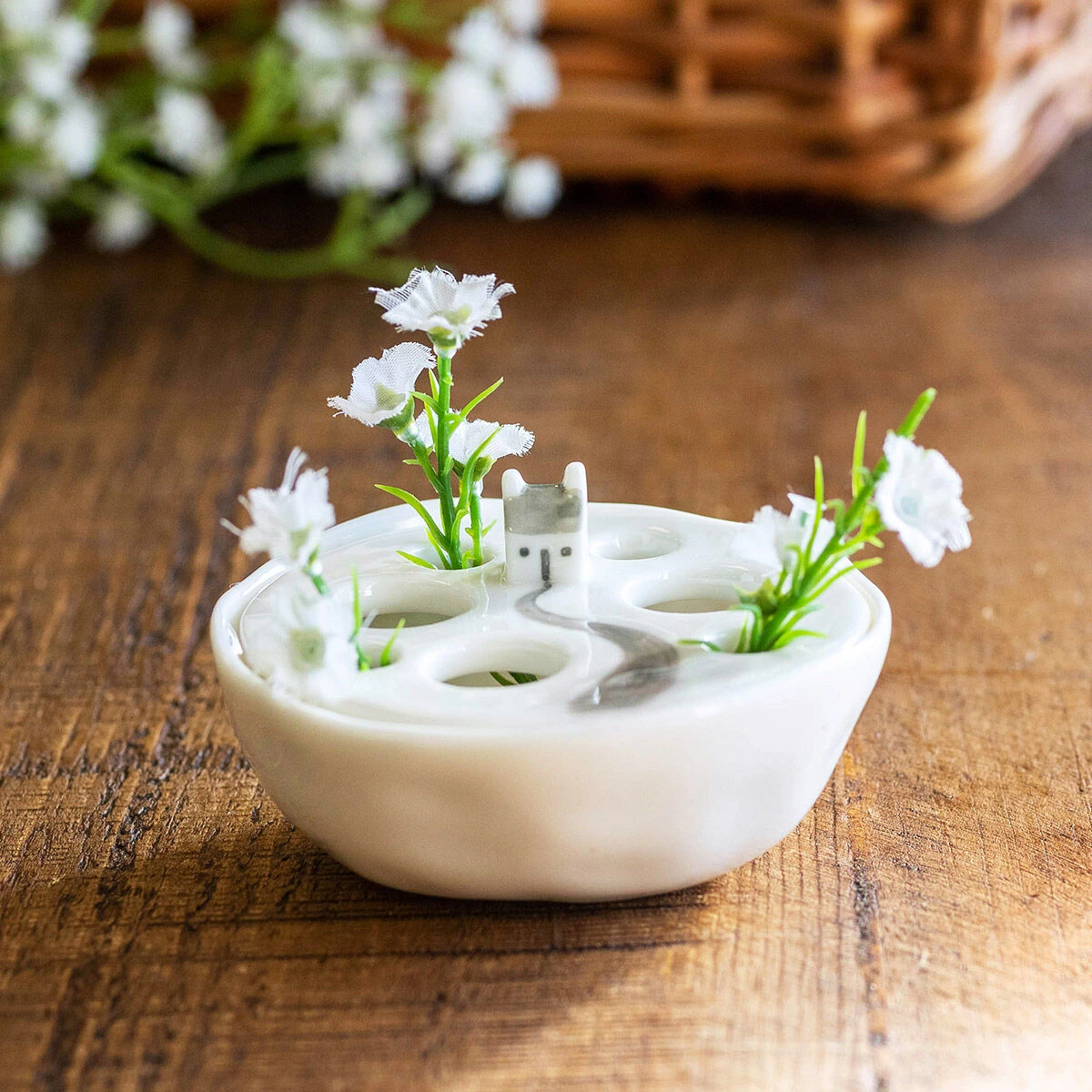 This vase is shaped like a bowl with a plate across the top with a small house and winding grey driveway leading up to it. There are holes in the plate where you can place small flowers and display them proudly anywhere in your home.