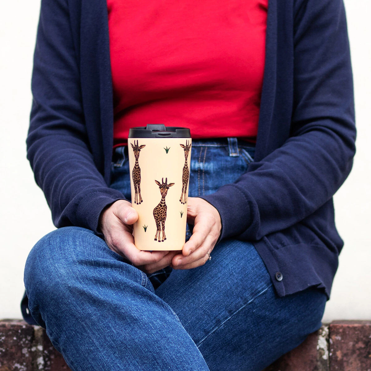 This durable travel mug is decorated with a plethora of fun giraffe in a repeat scatter pattern interspersed with a few green sprigs, the design is printed on a cream background, and the black lid allows the pattern to become the focal point.