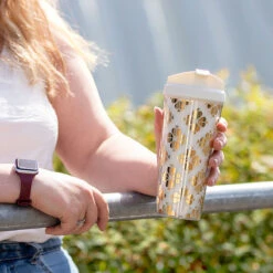 The lettering around the mug is the hand drawn design by Matthew Rice reads ‘TEA & COFFEE ON THE GO’. This contemporary style travel mugs comes with a black silicone lid and sleeve ideal for carrying.Â