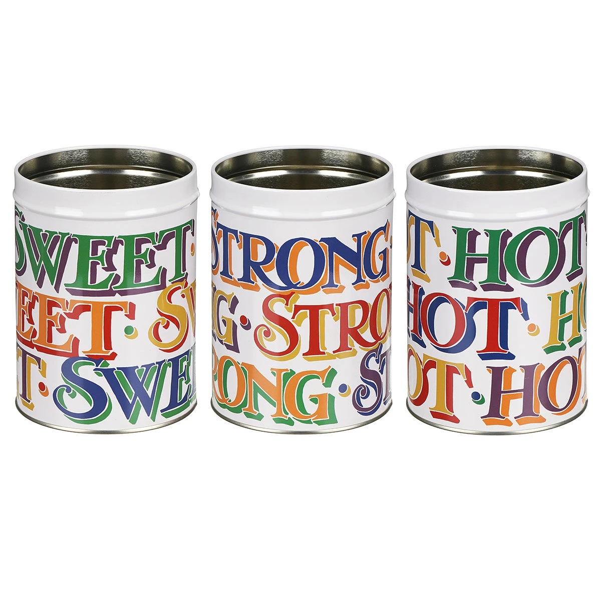 There are three different tins with unique designs, each featuring the stylish Brighter World text repeatedly printed in a range of bold and bright colours. The first tin is printed with the phrase ‘STRONG’, the second reads ‘SWEET’ and the third says ‘HOT’. The designs are scattered across a cream background allowing the patterns to stand out and create a striking look perfect for any kitchen.