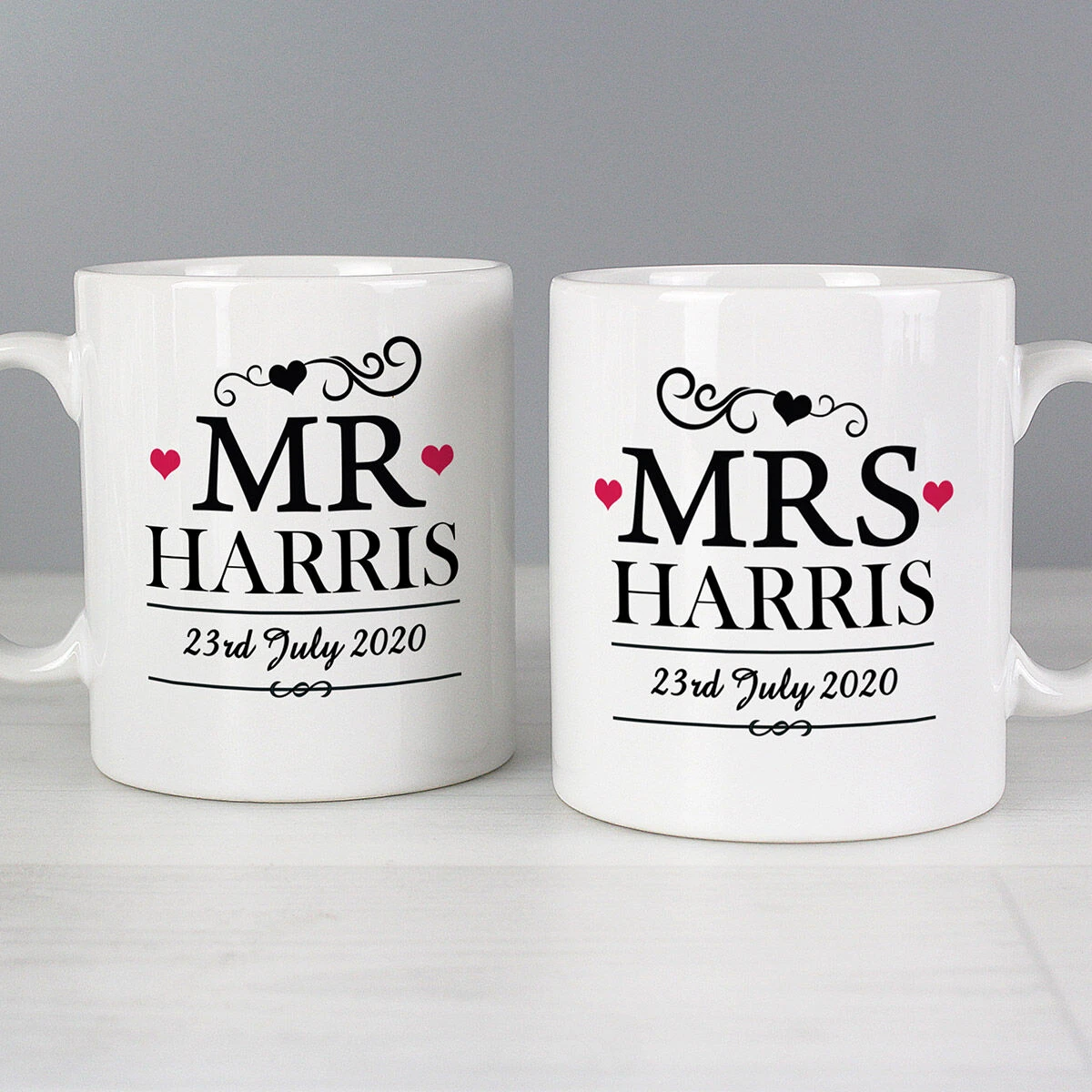 An inspired wedding or anniversary gift, this pair of mugs are white with the word MR on one and MRS on the other. The design is embellished with hearts and curlicues and a personal message may be added to create a unique gift.