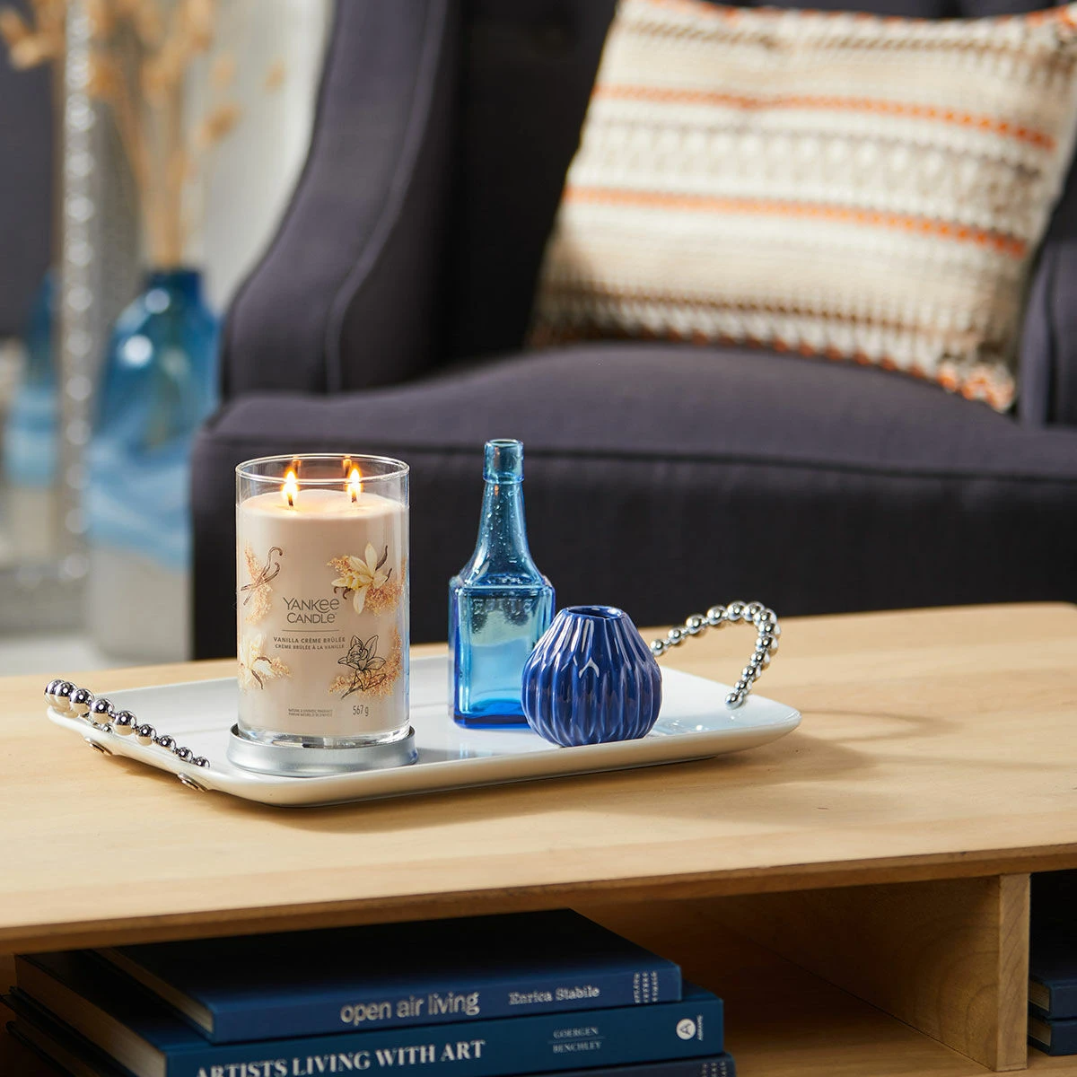 Enjoy the gorgeous aroma of Vanilla Crème Brûlée with this wonderful Signature Large Tumbler from Yankee Candle. This candle comes in a sleek glass vessel with straight sides that complement the fragrance and will look wonderful in any home décor theme. The candle comes with a silver metal lid that doubles as a stand to sit your candle on to protect your surfaces. This aroma will remind you of the rich and creamy vanilla custard dessert intertwined with toasted praline and a hint of cinnamon. It will leave your mouth watering for the delicious treat topped with a crisp layer of caramelised sugar.